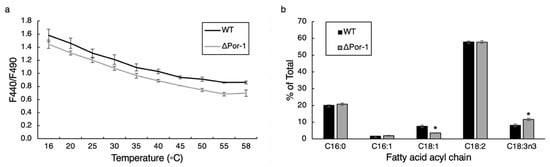 The ΔPor-1 N. crassa strain was cold-sensitive and displayed abnormal mitochondrial morphology [12]. These phenotypes likely reflect membrane characteristics in addition to changes in membrane proteomes. As a first step to investigate membranes of ΔPor-1 mitochondria, fluorescence of the probe Laurdan was utilized to assess overall membrane fluidity (Figure 5a). One relative measure of membrane fluidity is the ratio of Laurdan fluorescence at 440 nm to that at 490 nm (F440/F490); a higher ratio is indicative of lower fluidity because the emission of the probe shifts towards the red end of the spectrum (approximately 490 nm) when the membrane is in the fluid phase [36,58,59].