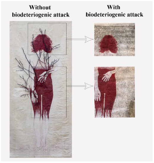 Biodeteriogens (bacteria, archaea, fungi, lichens, and insects) are a serious danger for the conservation of all cultural heritage including that made with modern materials. Climate, conservation, the chemistry, and the composition of the materials define the rate of microbial colonization and are at the basis of biodeterioration phenomena. Therefore, one of the main challenges in managing biodeterioration is the control of microbial growth to avoid the complete destruction of the canvas painting. The decontamination of these works requires the use of chemicals with a high toxic potential for both humans and the environment, besides high costs for museums [2,3].