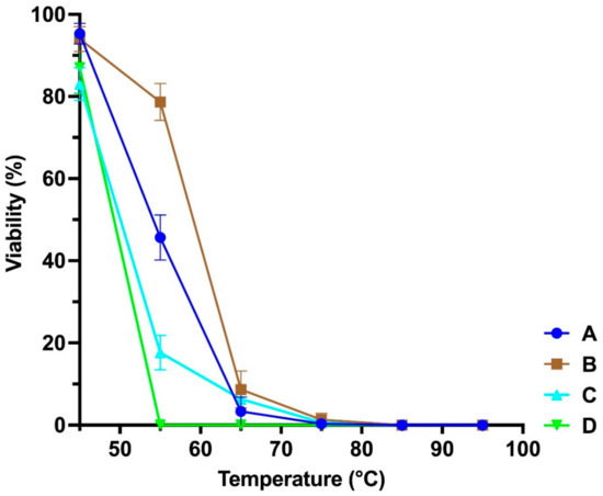 Thermal stability of bacteriophages: (A) Pseudomonas Phage_AUS260, (B) Pseudomonas Phage_AUS391, (C) Pseudomonas Phage_AUS301 and (D) Pseudomonas Phage_AUS034.
