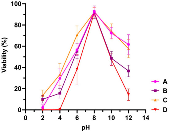 Sensitivity of bacteriophages to pH. (A) Pseudomonas Phage_AUS034, (B) Pseudomonas Phage_AUS301, (C) Pseudomonas Phage_AUS260 and (D) Pseudomonas Phage_AUS391.
