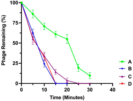 Adsorption characteristics of bacteriophages: (A) Pseudomonas Phage_AUS34, (B) Pseudomonas Phage_AUS301, (C) Pseudomonas Phage_AUS260 and (D) Pseudomonas Phage_AUS391.