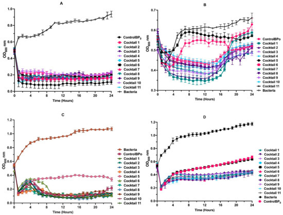 The amount of 5 × 106 cfu of the phages or of the cocktail was mixed with a mid-exponential culture of each of the bacteria at an MOI of 0.01 in a flat-bottomed 96-well plate. The killing action against each of the bacterial strains was assessed independently in triplicate for 24 h in a CLARIOstar plate reader (BMG Labtech, Ortenberg, Germany) at OD600. Each assay had a bacterial control with the bacteria alone, a phage control with the phages and the original bacteria used in its isolation (ControlBPo, Clark, Philippines), a blank consisting of the LB broth medium only and finally the phage cocktails against the bacteria. Readings were taken every 5 min for 24 h. The phage killing curves were plotted hourly over 24 h.