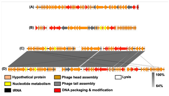 Diagram showing the alignment and genomic synteny comparison between the four phages: (A) Pseudomonas Phage_AUS034, (B) Pseudomonas Phage_AUS260, (C) Pseudomonas Phage_AUS301 and (D) Pseudomonas Phage_AUS391. The coding sequences identified are represented by the arrows.