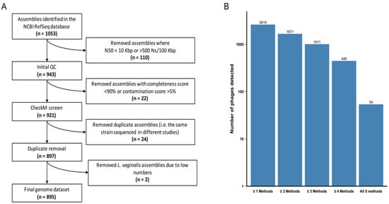 Genomes of Lactobacillaceae genera commonly present within live therapeutics for vaginal health that were available on 1 June 2019 were downloaded from the NCBI RefSeq assembly database (Table S1), including genomes of Lactobacillus acidophilus (n = 37), Lactobacillus crispatus (n = 91), Lactobacillus gasseri (n = 29), Lactobacillus helveticus (n = 53), Lactobacillus iners (n = 21), Lactobacillus jensenii (n = 18), Limosilactobacillus mucosae (n = 11), Lactiplantibacillus plantarum (n = 434), Limosilactobacillus reuteri (n = 125), Lacticaseibacillus rhamnosus (n = 149), Ligilactobacillus salivarius (n = 82) and Limosilactobacillus vaginalis (n = 3). This initial dataset (n = 1053) was filtered by excluding assemblies with N50 < 10 Kbp (n = 9) and >500 ambiguous bases (Ns) per 100 Kbp (n = 101). The filtered dataset was assessed using CheckM (version 1.1.3) [59] and assemblies with a completeness score of <90% and/or evidence of contamination at >5% were excluded (n = 22). Duplicate sequences defined as sequences originating from the same strain were manually identified and removed (n = 24), retaining only the highest quality sequences in each case. This resulted in a final dataset of 897 high-quality genomes.