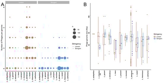 Putative bacteriophages that are detectable within publicly available Lactobacillaceae genome sequences. (A) Number of putative bacteriophages per Lactobacillaceae genome in the lenient (red) and stringent (blue) datasets. The size of each dot is proportional to the total number of strains with the indicated number of putative bacteriophages. (B) Genome sizes of the detected bacteriophages genome in the lenient (red) and stringent (blue) datasets. * indicates that the adjusted p-value was <0.05, and ** indicates that the adjusted p-value was <0.01.