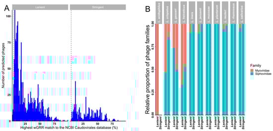 Weighted gene repertoire relatedness (wGGR) for predicted prophages in the lenient and stringent datasets. (A) The highest hits wGRR match of the predicted bacteriophages to bacteriophages in the NCBI Caudovirales database in the lenient and stringent datasets. (B) Relative proportions of likely bacteriophage families in the lenient and stringent datasets calculated using the wGRR approach by Lactobacillaceae spp.
