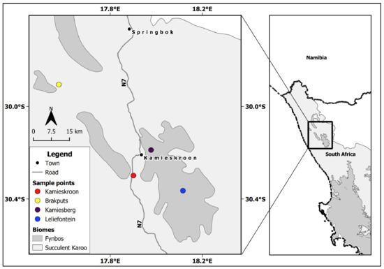 - Mucina, L.; Jürgens, N.; Le Roux, A.; Rutherford, M.C.; Schmiedel, U.; Esler, K.J.; Powrie, L.W.; Desmet, P.G.; Milton, S.J.; Boucher, C. Succulent Karoo Biome. In The Vegetation of South Africa, Lesotho and Swaziland; Strelitzia: Pretoria, South Africa, 2006; Volume 19, pp. 221–299. [Google Scholar]