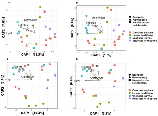 - Anderson, M.J.; Willis, T.J. Canonical analysis of principal coordinates: A useful method of constrained ordination for ecology. Ecology 2003, 84, 511–525. [Google Scholar] [CrossRef]