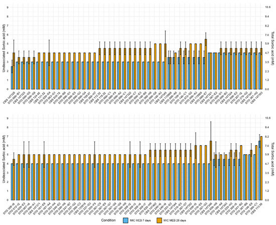 MIC assay showing strain diversity of 100 A. niger strains grown in MEB. Mean MIC values for each strain was determined after seven days (blue), and 28 days (orange) of growth at 25 °C, from biological duplicates. The error bar indicates the standard deviation between the duplicates. The primary Y-axis indicates the undissociated sorbic acid concentration, whereas the secondary Y-axis indicates the total sorbic acid concentration.