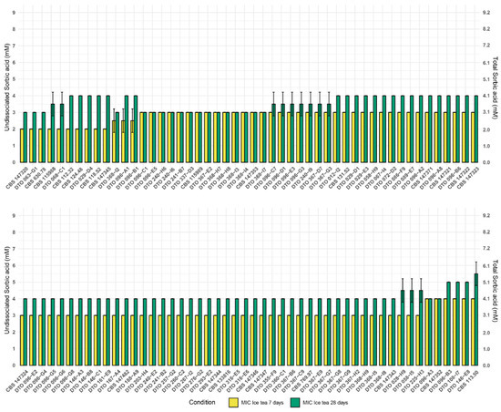 MIC assay showing strain diversity of 100 A. niger strains grown in ice tea. Mean MIC values for each strain was determined after seven days (yellow), and 28 days (green) of growth at 25 °C, from biological duplicates. The error bar indicates the standard deviation between the duplicates. The primary Y-axis indicates the undissociated sorbic acid concentration, whereas the secondary Y-axis indicates the total sorbic acid concentration.