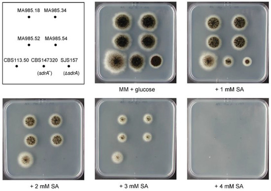 Phenotypic screen of CBS 147320 transformants with a restored sdrA locus on sorbic acid. The transformants with a confirmed restored sdrA locus were tested on sorbic acid resistance. The spot assay was conducted on MM + glucose with the addition of sorbic acid (SA), concentrations given of undissociated sorbic acid. Conidia were spotted and plates were subsequently grown for four days at 30 °C. Several controls were taken along; they are sorbic-acid-resistant strain CBS 113.50, sorbic-acid-sensitive wild-type strain CBS 147320 (sdrA−) and sorbic-acid-sensitive knock-out strain SJS157 (ΔsdrA). Transformants were resistant to SA when compared to the parental strain CBS 147320 and the ΔsdrA deletion strain SJS157. The four transformants with a restored sdrA gene show SA resistance comparable to the most resistant wild-type strain CBS 113.50.