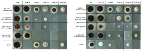 Spot assays on MM containing weak acids were performed by spotting 5 µL of a 106 conidia/mL spore stock solution, and the concentration determined by using a TC20 automated cell counter (Bio-Rad, Hercules, CA, USA), thereby inoculating a total of 5000 conidia per spot. Spot assay plates were cultivated for four days at 30 °C, after which pictures were taken and growth was determined, unless noted otherwise.