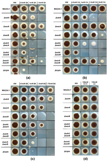 Weak-acid stress resistance of knock-out strains lacking sdrA, warA and/or warB. Conidia are spotted on MM containing glucose and weak acid, pH 4, grown for four days at 30 °C. Growth was compared to the growth phenotype of the parental strain MA234.1 (ΔkusA). All concentrations of weak acids added listed are total weak-acid concentrations: (a) sorbic acid (SA) stress resistance. The triple knock-out strain is the most sensitive for sorbic acid stress. A double knock-out strain ΔwarA, ΔwarB is less sensitive than the single knock-out strain ΔwarB; (b) cinnamic acid (CA) stress resistance. The ΔsdrA, ΔwarB strain is the most sensitive to cinnamic acid, the warA deletion does not seem to affect cinnamic acid stress resistance; (c) benzoic acid (BA) stress resistance. The warB deletion has the largest effect on the benzoic acid resistance; (d) citric acid (Cit A) and lactic acid (LA) stress resistance seemed unaffected.
