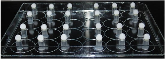 Dense ceramic HAp discs with a 5 mm diameter and 2 mm thickness (Clarkson Chromatography Products Inc., South Williamsport, PA, USA) were vertically assembled in acrylic holders attached to the lid of a 24-well culture plate, leaving an area of approximately 70.7 mm2 exposed (Figure 1). Subsequently, the assembled lid with the HAp discs was sterilized by exposing it to ultraviolet light for 1 h.