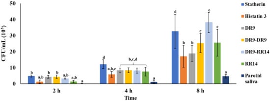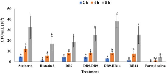 The mean values of the number of viable bacteria for each treatment at each time point are shown in Table 2. The pairwise comparison made within treatments at each time point (Figure 2) showed significant differences among groups (p < 0.05). As expected, the number of bacteria adhered increased over time, with the mean values obtained at 2 h being statistically different from those obtained at 4 h and 8 h within the groups statherin, DR9-RR14, and RR14, while in the remaining groups, a significant difference was only observed between 4 h and 8 h (p < 0.05) (Figure 2).