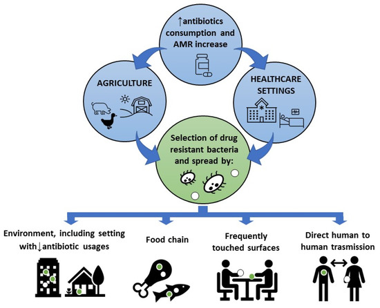 Environmental pollution and antimicrobial resistance (AMR) are major public health challenges of our time. According to the European Centre Disease and Control (ECDC), each year in Europe at least 4 million people catch an antibiotic resistance infection, leading to over 40,000 deaths [1], and WHO estimated at least 10 million deaths within 2050, if no concrete global action is taken against AMR as soon as possible [2]. AMR has primarily developed as a result of the selective pressure exerted by the widespread use of disinfectants and antibiotics in the hospital settings, as well as in agriculture [3], livestock, and in the general community. As a consequence, the microorganisms persistently contaminating those environments became drug, multi-drug, or pan-drug resistant (MDR, panDR), then spreading rapidly through the environment (including that with low antibiotic usage such as private homes), the food chain, the frequently touched surfaces, or via direct contact between humans (Figure 1).