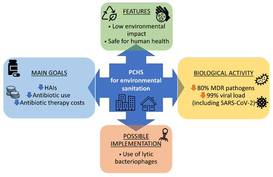 As a further potential improvement, at the moment limited to the hospital environment, specific removal of individual bacterial targets could be accomplished by the addition of lytic bacteriophages to cleansers. Bacteriophages are viruses infecting only bacteria with high specificity and rapidity, and their successful applicability has been reported for the decontamination of food and food-processing surfaces in industrial settings [111]. No studies on the effectiveness of phages in domestic environments are available yet, however their effective application against MDR bacterial strains was reported in the hospital environment [112,113], suggesting that a combined phage and probiotic-based cleaning may provide an effective way to stabilize the BE microbiome in different settings. Figure 2 summarizes the main PCHS features, as well as its biological target and the main goals achieved by the experiments.