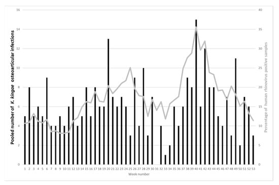 Recently, a French study analyzed the seasonality of K. kingae OAI in two tertiary-care centers in Paris on a 7-year period, including 322 cases of K kingae osteoarticular infection and compared the seasonality with the data of respiratory virus detection from the Réseau National des Laboratoires network in coordination with the National Influenza Center of France [12]. The authors observed high activity for both K. kingae osteoarticular infection and HRV during the fall (98 (30.4%) and 2401 (39.1%) cases, respectively) and low activity during summer (59 (18.3%) and 681 (11.1%) cases, respectively). Weekly distributions of K. kingae osteoarticular infection and rhinovirus activity were significantly correlated (r = 0.30; p = 0.03), while no significant correlation was found between the weekly distribution of K. kingae osteoarticular infection and respiratory syncytial virus, influenza virus, and metapneumovirus [12] (Figure 1).