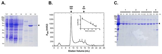Purification of LiGDP-MP. (A) Coomassie blue-stained SDS-PAGE of LiGDP-MP purified from the Ni-NTA column. TOT: total; SN: Supernatant; FT: Flow Through; W: Wash; E1, E2 and E4: elution fraction at 100, 200, and 400 mM imidazole, respectively. The arrowhead shows the protein of interest. The protein ladder on the left is indicated in kDa. (B) Size exclusion chromatography profile of LiGDP-MP. In the inset, the filled triangles and open circles represent standard proteins and the peaks of the protein of interest, respectively. mAU = milli-Absorbance Unit. MW = Molecular Weight. (C) Coomassie blue-stained SDS-PAGE of the fraction volumes of peaks 1 (8.5–10 mL), 2 (12.5–13.5 mL), 3 (14–15.5 mL), and 4 (16–16.5 mL). Lo is the loading control. The arrowhead shows the protein of interest. The protein ladder on the left is indicated in kDa.