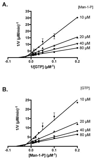 In order to determine the kinetics of substrate binding, the mechanism of reaction of LiGDP-MP was then further investigated by measuring the enzyme activity using a range of GTP concentrations and fixed Man-1-P concentrations (Figure 4A), and vice versa (Figure 4B). Both double inverse plots intersect on the left of the 1/y axis. These results are therefore consistent with the formation of a ternary complex, composed of the enzyme, GTP, and Man-1-P, with a sequential mechanism of substrate binding [23]. Moreover, the intersection of both double plots above the 1/x axis is in favor of a sequential random mechanism, where the fixation of one substrate is favored by the previous fixation of the other.