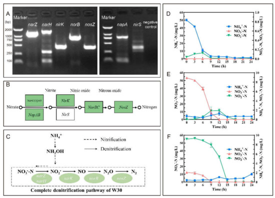 Isolate W30′s potential and capacity on N removal. (A): The amplification of denitrification genes of isolate W30. (B): Reference denitrification pathway of Pannonibacter phragmitetus 31801 (GenBank: CP013068) from KEGG database (www.genome.jp/pathway/pphr00910/, accessed on 1 November 2021). (C): Proposed denitrification pathway of isolate W30. Nitrogen removal characteristic of isolate W30 in media of (D) HNM, (E) DM1, and (F) DM2. Symbols: ■, NH4+-N; ▲, NO3−-N; ▼, NO2−-N. Values represent the mean ± SD (standard deviation) of three replicates.
