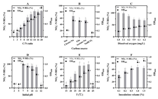 Species-specific constraints on NO3−-N removal mediated by W30. (A) C/N ratio; (B) carbon sources, Suc and Glu denoted sucrose and glucose, respectively; (C) dissolved oxygen; (D) initial pH; (E) temperature; (F) inoculation volume. Values with different letters indicate being significantly different at p < 0.05.