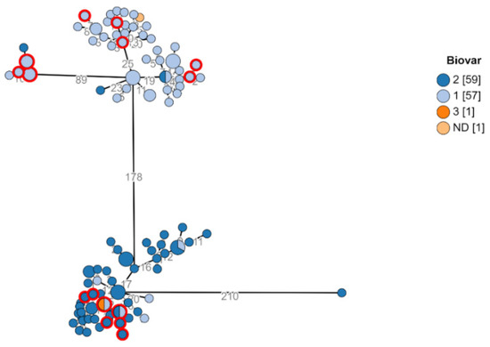 The phylogenetic analysis of the Israeli isolates was conducted using the ad hoc core genome MLST method. Creating a cgMLST scheme for the 118 Israeli B. melintesis isolates involved identifying a core set of loci (2926) present in at least 95% of the 118 genomes. The isolates were all sequence-typed as ST8 and belonged to biovar 1, 2, and 3 in 48.3%, 50%, and 0.85% of all cases, respectively. This analysis showed a distinct division into two major clusters in the MST, where the two main biovars were evident within the two main clusters (Figure 1).