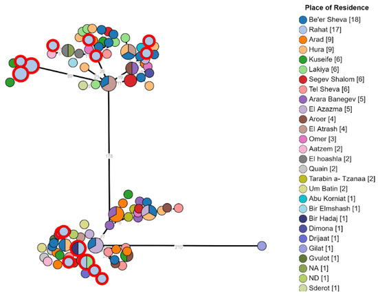 Biovars of Brucella melitensis in Southern Israel. Minimum spanning tree showing phylogenetic analysis of B. melitensis isolates from Southern Israel. Study isolates (n = 118) ad hoc cgMLST for a core genome of 2926 loci. Each node represents a genome, and numbers account for the number of differing alleles between nodes (not to scale). Every node represents an isolate. Each color represents a different Biovar. Nodes representing isolates from the city Rahat are marked in red circles as an example of isolates scattering among the two clusters. Each color represents a different Bio-variant. Multicolored nodes represent different genomes with no variation.