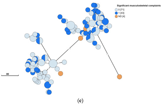 Clinical and epidemiological characteristics of Brucella melitensis in Southern Israel. B. melitensis was cultured and isolated from 118 patients. The phylogenetic analysis had been conducted using the ad hoc core genome MLST method as mentioned above. The minimum spanning tree shows the phylogenetic analysis of B. melitensis isolates from Southern Israel. Each node represents a genome, and numbers account for the number of differing alleles between nodes (not to scale). Each color represents an age (child or adult) (a), sex (F/M) (b), and significant musculoskeletal complaints (0—no; 1—yes; ND—not detected) (c). Numbers in square brackets indicate the total number of isolates from each characteristic.