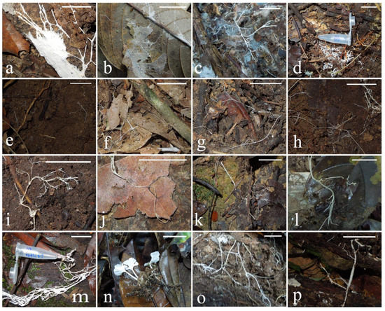 Photographs of fungi growing on leaf litter and small woody debris in situ prior to collection. Cords were loosely grouped according to thickness of cords. Scale bar is 2 cm. Sheet-forming: (a) BOR78, (b) BOR96, (c) BOR202, (d) BOR94. Thin cords: (e) BOR77, (f) BOR79, (g) BOR81, (h) BOR82. Thick cords: (i) BOR 83, (j) BOR86, (k) BOR88, (l) BOR99, (m) BOR91, (n) BOR110, (o) BOR201, (p) BOR80.