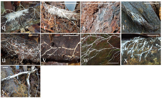 Taxonomic identification based on gross cord morphology alone was not possible, and hence the need for molecular identification. There were no hard boundaries between morphology types; however, cords were grouped by morphology as far as reasonably possible so that any potential patterns in the distribution of cord morphology across the phylogenetic trees could be linked to their molecular taxonomy. We did not find any obvious cord morphology patterns distinct to certain taxa or clades (Figure 3). It is possible that the different cord morphologies observed such as thickness are related to growth substrate or the age/life cycle stage of the fungi as opposed to a fixed morphology for that taxon [55]. This would explain the morphological differences observed between the collected fungi despite close genetic relationships. For example, BOR91 and BOR97 have identical sequences; however, they do not look identical (Figure 1m and Figure 2x, respectively); as such, they have been classified into different morphological groups. However, it is worth noting they are growing on different substrates, which could be an explanation for the morphological differences.