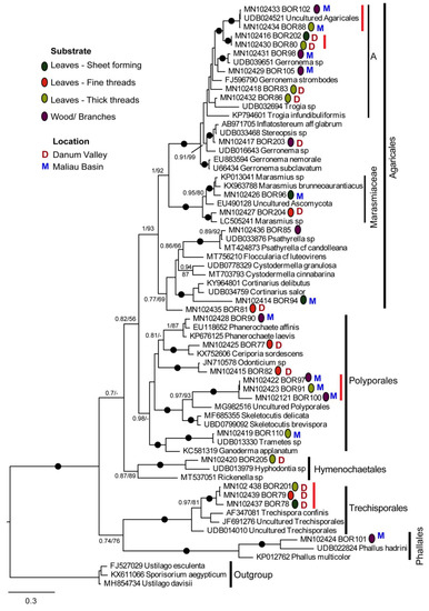 We generated 26 18–28S sequences from 27 samples; we were unable to amplify this region for BOR99. Phylogenetic analyses (Figure 3) showed that these resolved into 20 clearly distinct lineages, all grouping within Agaricomycetes (Phylum Basidomycota). The majority of sequences branched within the orders Agaricales and Polyporales, with others in Trechisporales, Phallales, and Hymenochaetales. Figure 3 also indicates the substrate on which the fungal cords were growing and whether the samples were collected in the Danum Valley or Maliau Basin.
