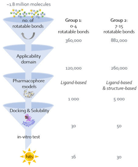 The computational procedure in this work includes the use of several methods or filters, one after another, in order to filter a large molecular database, Enamine, and find active compounds for the selected target, TLR4/MD2. (1) The first step is filtering by the number of rotatable bonds. There were 2 parallel filtrations: for molecules with 0–4 rotatable bonds (“group 1”) and molecules with 7–15 rotatable bonds (“group 2”). (2) The second step is filtering the resulting molecules of groups 1 and 2 from the previous step, by the applicability domain properties of the known active molecules: no. of donor atoms, no. of acceptor atoms, logP, and molecular weight. (3) The third step is filtering groups 1 and 2 from the previous step, with a pharmacophore model, which can be based on known ligands for the target or on a known crystal structure of the target. Specifically, group 1 was filtered only by a ligand-based pharmacophore model, while group 2 was filtered by a ligand-based, as well as a structure-based pharmacophore model. (4) The last step is filtering groups 1 and 2 from the previous step, by docking to TLR4/MD2 crystal structure (PDB code: 2Z65), using two docking programs: FRED and FlexX. The resulting molecules were then filtered by calculating solubility descriptors using three methods. The candidates that passed all of these filters were later examined in vitro to find whether they are indeed active on TLR4.