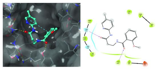 Both sets that were based on a different number of rotatable bonds were docked to the 2Z65 structure and evaluated for their solubility by several algorithms. Among the top 100 molecules, about 60 had H-bonds with either Ser-120 or Tyr-102. Most of the other interacting residues are hydrophobic: Ile-63, Ile-74, Phe-76, Ile-94, Phe-104, Ile-117, and Phe-119. Finally, 46 molecules (30 with 7–15 single bond rotations and 16 with 0–4 rotations) were selected for experimental confirmation. Figure 1 gives an overview of the selection process and Figure 2 presents the docking position of T6030504 that was among the best performing molecules in the cell-based assay.