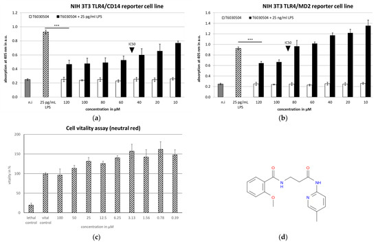 Cell-based screening assays for validation of TLR4 Antagonists: Dose-response analysis of T6030504 to identify the minimal inhibitory concentration necessary to block the TLR4 receptor complex in NIH 3T3 TLR4/CD14 (a) and NIH 3T3 TLR4/MD2 reporter cell lines (b). Black triangle points to the IC50-value of the compound. LPS was used to activate the TLR4 receptor complex in NIH 3T3 TLR4/CD14 reporter cells with a concentration of 25 pg/mL and in NIH 3T3 TLR4/MD2 reporter cells with a concentration of 25 ng/mL. The supernatant was collected and the substrate p-NPP was added to monitor the NF-κB-dependent SEAP secretion. The results are given for one representative experiment with three replicates. Significant differences are indicated with the t-test and p < 0.001 *** (c) Neutral red assay to detect cytotoxicity of the compound under test conditions with NIH 3T3 TLR4/CD14 cell line. The results are expressed as means ± SD for three experiments. (d) Chemical structure of T6030504.