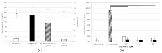 Characterization of T6030504 with primary human immune cells. Antagonistic activity is shown in PBMCs (buffy coat from multiple donors) and in human whole blood. (a) Effect of T6030504 on IL-1β secretion. PBMCs were incubated with 200 pg/mL LPS as TLR4 agonist and 15 µM T6030504 TLR4 antagonist. As control 60 µM T6030504 was added without LPS, showing no effect by itself. Black squares show the viability test via staining with neutral red, done in parallel. Data shown are given for one representative duplicate and expressed as mean ± SD. (b) IL-1β cytokine levels in the supernatant of human whole blood from donor 1999, A+. Whole blood is incubated with 100 pg/mL LPS in the absence and presence of the TLR4 antagonist (T6030504) at the concentrations indicated. Cytokine levels were measured in the supernatant after 24 h of incubation. The results are given for one representative duplicate experiment and expressed as means ± SD. Significant differences are indicated with the t-test and p < 0.05 *.