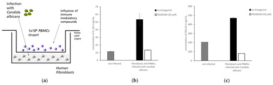 We previously showed that immune cells from human blood, like PBMCs and CD4+-T cells, activate dermal fibroblasts in 3D-skin infection models to engage in anti-microbial defense [18]. We hypothesized that a simplified version of a fibroblast-immune cell co-culture system would yield similar results, however, with much easier handling and reduced turnaround time. Cultivation of dermal fibroblast in a well-plate is less time consuming than setting up a skin model, as shown below. As a readout, the secretion of the antimicrobial peptides and chemokines by the fibroblasts to fend off intruding pathogens can be monitored in the media using standard ELISA assays. Figure 5a shows the general setup of the co-culture system. The dermal fibroblasts were cultivated in a 24-well plate up to confluence. Then the PBMCs were added to the well using a membrane-sealed trans-well insert prohibiting cellular transfer. Thus, the membrane physically separates PBMCs and dermal fibroblasts in two compartments, which can be incubated separately with pathogens and test-compounds. Using this co-culture system, we analyzed if T6030504 has an effect on the IL1-β and CXCL-1 secretion of dermal fibroblasts incubated with C. albicans in the presence of human PDMCs. Infection of the system was initiated by adding the fungal pathogen C. albicans to the fibroblast compartment. PBMCs were pre-incubated with T6030504 or mock treated as described in Materials and Methods. As shown in Figure 5b,c, the infection induces secretion of IL1-β and CXCL-1 into the medium supernatant. Pre-incubation of the PBMCs with T6030504 reduces the levels of both IL1-β and CXCL-1 secretion to the level of the not-infected system. Thus, T6030504 is able to suppress inflammatory reactions in a co-culture system with human PBMCs and fibroblasts in the presence of the fungal pathogen C. albicans.