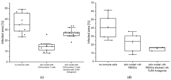 Skin models were generated as described previously [17,18]. SF1-fibroblasts [28] were embedded in a collagen matrix for the dermal part, Ker-CT-cells (ATCC-CRL4048) were grown on top as the epidermal part and CD4-positive T cells or PBMCs were added below the dermal part of the skin. The immune cells were isolated from voluntary male donors. Histopaque gradient (Merck, Darmstadt, Germany) was used to separate the PBMCs from erythrocytes and granulocytes. The PBMC cell layer was used for further isolation of CD4+ T cells with antibody separation using the naïve CD4+ T-cell Isolation Kit II (Miltenyi Biotech, Bergisch Gladbach, Germany) and activated with Dynabeads® Human T-Activator (Thermo Fisher Scientific, Darmstadt, Germany) with CD3/CD28-labeled beads for 24 h at a cell-to-bead ratio of 5:1. The immune cells were pre-incubated for 6 h with the antagonist before integration in the skin model. After 24 h the skin model was infected with 100 CFU of a C. albicans overnight culture (clinical isolate SC5314, 30 °C, 350× g in YPD (BD, Heidelberg, Germany) by adding the microorganism on top of the cornified epidermis for 48 h in a humidified incubator at 37 °C. After 48 h the skin models were fixed with Bouins solution (Carl Roth, Karlsruhe, Germany) for 1 h, and dehydrated and embedded in paraffin. The sections were cut in 4 µm tissue sections and de-paraffinized for Periodic acid-Schiff (PAS) staining. Staining of the fungi was performed with 1% periodic acid for 15 min and Schiff reagent (Merck, Darmstadt, Germany) for 30 min. Sections were washed three times with 0.05 M HCl, 0.6% Na2S2O5 and differentiated in tap water for 15 min. Afterwards tissue sections were stained with Mayer’s Hemalaun (Dako, Jena, Germany) solution (8 min) and Eosin B (Merck, Darmstadt Germany) (1 min). Hematoxylin is used to stain the cell nucleus and Eosin to monitor the formation of keratin in the epidermis. The dermal invasion of C. albicans was quantified by measuring the infected dermal area and the total dermal area using ImageJ (2012, Schneider).