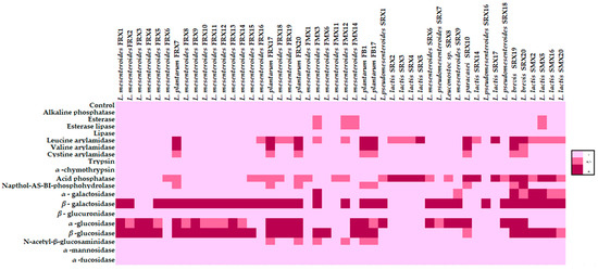 Enzymatic activity of the 48 LAB isolates determined by API ZYM 25,200. The color intensity of enzymatic reactions represents the enzymatic activity of each isolate: dark pink: “+” strong activity; pink: “+/-“ moderate activity; light pink: “-“ no activity.