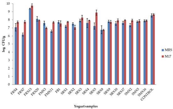 Microbial counts (log CFU/g) of LAB (MRS) and lactic cocci/streptococci (M17) of the control yogurt sample and of the 19 LAB isolates used as co-cultures in the yogurt samples at refrigerated storage, 24 h after production. The error bars represent the standard deviation of the mean values (n = 3).