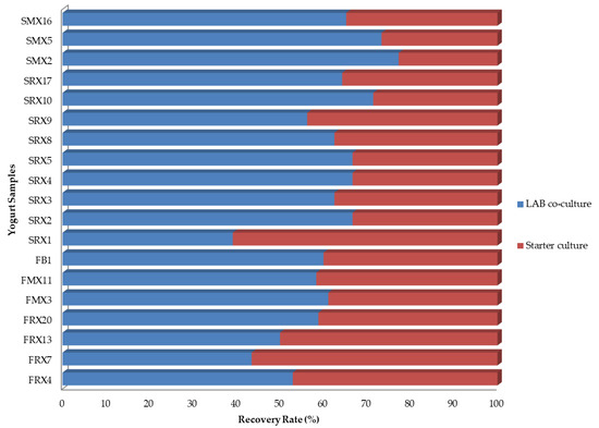 Recovery rates of the 19 LAB isolates, used as co-cultures in yogurt samples after molecular analysis.