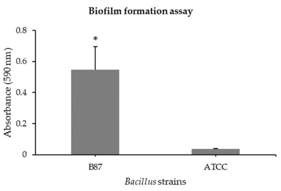 The ability of Bacillus sp. B87 to produce biofilm was determined in comparison with B. cereus ATCC 14579. A microtiter plate assay for biofilm formation revealed that the biofilm level of Bacillus sp. B87 (OD590 0.545 ± 0.149) after incubation for 24 h was significantly higher than that of B. cereus ATCC 14579 (OD590 0.035 ± 0.002) (Figure 1).