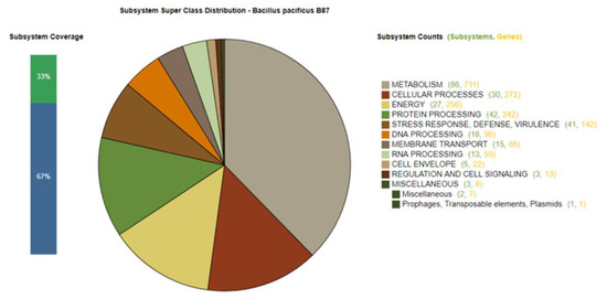 Genomic features and annotation information for the genome of Bacillus sp. B87 are summarized in Table 2. The draft genome sequence had an estimated length of 5,448,163 bp, a GC content of 35.18%, and contained 5661 coding sequences. The circular representation of the Bacillus sp. B87 draft genome was generated using the circular viewer of PATRIC and is shown in Figure 2. Potential genes in the draft genome of Bacillus sp. B87 were investigated and annotated based on different biological processes and metabolic pathways using the RAST server (Figure 3). The predicted genes included 711 genes involved in metabolism, 272 genes involved in cellular processes, and 142 genes involved in stress response, defense, and virulence. Genes involved in prophages, transposable elements, and plasmids were also found in the draft genome of Bacillus sp. B87, and were classified as: subclass: pathogenicity islands; subsystem name: Listeria Pathogenicity Island LIPI-1 extended. These pathogenicity islands were also present in the genomes of B. cereus ATCC 14579 and B. anthracis str. Ames.