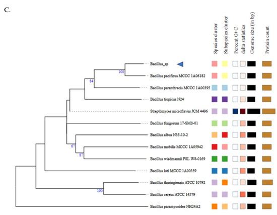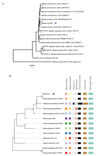 A phylogenomic tree based on the core genes was generated with PATRIC Phylogenetic Tree Building Service [23]. The default was set for codon trees, which utilizes both the protein and gene sequences from PATRIC’s global protein families (PGFams). Protein sequences were aligned using MUSCLE, and the nucleotide coding gene sequences were aligned using the Codon_align function of BioPython. A concatenated alignment of all proteins and nucleotides was converted to a phylip formatted file, and then a partitions file for RaxML was constructed. Support values were created using 100 rounds of the “Rapid” bootstrapping option of RaxML. The phylogenomic classification of Bacillus sp. B87 was also performed using the Type (strain) Genome Server (TYGS), a free bioinformatics platform for a whole-genome-based taxonomic analysis [24].