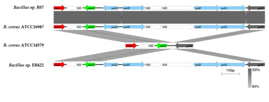 The differences in gene synteny between the genomes of Bacillus sp. B87 and B. cereus ATCC 14579 were apparent with the pelDEADAFG operon (Figure 5). Bacillus sp. B87 contained pelA, pelD, pelF, and pelG, and was therefore similar to B. cereus ATCC 10987 and Bacillus sp. EB422 (B. pacificus).