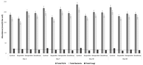 The structure and abundance of microbiota were monitored in Lycopersicon esculentum rhizosphere soils with and without the artificial contamination with commonly consumed NSAIDs during a 60-day assay period. The total microbial biomass was expressed as the sum of PLFAs with concentrations in control samples (without contamination) and those contaminated ranged between 165.6 and 240 nmol·g−1 dry weight soil during the assay (Figure 2). The control rhizosphere soil recorded higher values of PLFA (p < 0.05) with concentration ranges of 184.8–240 nmol·g−1 dry weight soil. In soils contaminated with NSAIDs, the microbial biomass in Lycopersicon esculentum rhizosphere soils has the following pattern: 187.9–215.4 (ketoprofen contamination) > 186.7–201.2 (diclofenac contamination) > 165.6–182.7 (ibuprofen contamination) nmol·g−1 dry weight soil, respectively (Figure 2).