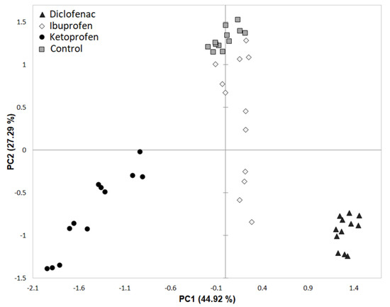 The PCA of the 48 PLFAs data (Figure 3) indicated that rhizosphere soil microbial community abundance was markedly affected by soil contamination with NSAIDs, but poor differentiation between control and contamination with ibuprofen was observed, indicated by their closest scores along the first principal component (PC1) and second principal component (PC2). The first two components, PC1 and PC2 explained 44.92% and 27.29% of the total variance in PLFAs abundance. The PC1 axis differentiated contamination with diclofenac and ketoprofen but did not differentiate controls by contamination with ibuprofen, whereas the PC2 axis did not differentiate well control samples by contamination with specific NSAIDs.