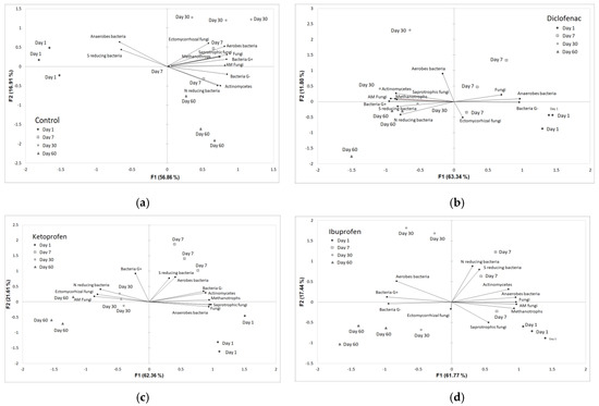The principal component analysis was used as a data reduction strategy to infer correlations between rhizosphere microbiota community structure abundance evolution in time for each contamination experiment (Figure 4). The first and second components of the principal coordinate accounted for 56.86% and 19.91% of the total variance of the microbiota structure abundance in time for no contamination (control, Figure 4a), 63.34% and 11.8% for diclofenac contamination (Figure 4b), 62.36% and 21.61% for ketoprofen contamination (Figure 4c) and 61.77% and 17.44% for ibuprofen contamination (Figure 4d).