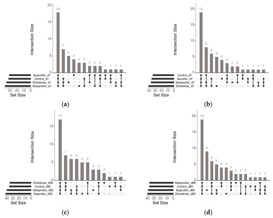 Between 16 and 11 upregulated volatile organic compounds responded specifically to the presence of NSAIDs. Among the remaining volatile organic compounds that were upregulated by at least two different pharmaceutical compounds, the highest intersection size was found to increase once with the duration of the assay (19 volatile organic compounds representing 37% of the total number of upregulated volatile organic compounds in rhizosphere soils after 60 days of assay, Figure 6d). Interactions varied in time with assay duration, volatile organic compounds that were upregulated by control and at least two different NSAIDs. The highest size was found after midterm exposure (day 30, Figure 6c) and short-term exposure (day 7, Figure 6b) of the assay. The similarities of volatile organic compounds in assays at very short-term exposure (day 1) were found for two upregulated volatile organic compounds when rhizosphere microbiota were exposed to ibuprofen and ketoprofen and two other upregulated volatile organic compounds were found when the exposure was for ibuprofen and diclofenac (Figure 6a). In the case of the short-term exposure assay (day 7), similarities of the volatile organic compounds were found for six upregulated volatile organic compounds when rhizosphere microbiota were exposed to ibuprofen and diclofenac (Figure 6b), five upregulated volatile organic compounds when rhizosphere microbiota were exposed to ibuprofen and diclofenac during the midterm exposure assay, and six upregulated volatile organic compounds when rhizosphere microbiota were exposed to ibuprofen and ketoprofen (Figure 6a).