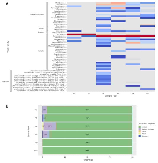 Abundance of viral families in pooled fecal samples of five bat species from Argentina identified by metagenomics. (A) Heatmap of relative abundances of viral families according to the number of reads found in each sample pool. The viral families are grouped according to host kingdom. (B) Relative abundance of viral reads classified at the kingdom level in each sample pool. Percentages higher than 1% are shown. P1 and P2: T. brasiliensis; P4: E. diminutus and E. patagonicus; P6 and P9: M. molossus; P11: E. bonariensis.